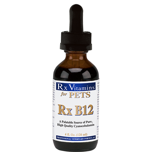 Vitamin B12 traditionally has been administered parenterally for chronic enteropathies and EPI. It can be challenging for clients to bring their pets in monthly for these injections. Recent studies have found that daily oral administration of cyanocobalamin will just as effectively increase serum cobalamin levels as monthly injections. Rx Vitamins proudly introduces Rx B12, in a highly palatable liquid format for easy and convenient oral administration of cyanocobalamin to your patients. The 120 ml bottle will supply a larger (>50 pounds) patient for a month, and for a patient less than 25 pounds it will last 4 months.