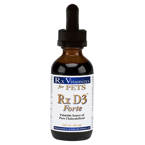 Rx D3™ Forte contains cholecalciferol, the precursor to Vitamin D3 for all animals. The cholecalciferol is blended with MCT oil. The cholecalciferol is blended with MCT oil at a higher concentration than the standard Rx D3. This provides 5 times the potency per drop to better suit the needs of the severely vitamin D3 deficient patient, the larger patient, or any other patient that would benefit from a higher concentration. Rx D3 Forte comes with a glass graduated dropper to facilitate accurate serving size